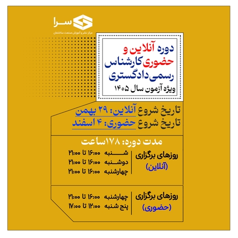 - ثبتنام حضوری: جهت ثبتنام حضوری در دورهها، در ساعات اداری شنبه تا چهارشنبه از ساعت ۹ تا ۱۸ و پنجشنبه از ساعت ۹ تا ۱۵ به دفتر مؤسسه سرا مراجعه بفرمایید:
